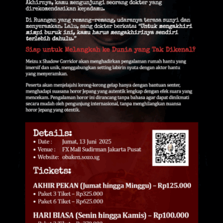 Lalu, siapakah dalang di balik semua kengerian ini? Pengalaman premium ini dirancang langsung oleh OBAKEN, sebuah grup hiburan horor yang berbasis di Tokyo. Mereka adalah master dalam menciptakan “horor yang digerakkan oleh plot”. Sejak 2012, OBAKEN menjadi ahli hiburan horor dengan memadukan akting, pencahayaan, suara, dan desain panggung untuk memproduksi sebuah ketakutan yang terasa begitu nyata, dan kini mereka membawa keahliannya ke Jakarta.