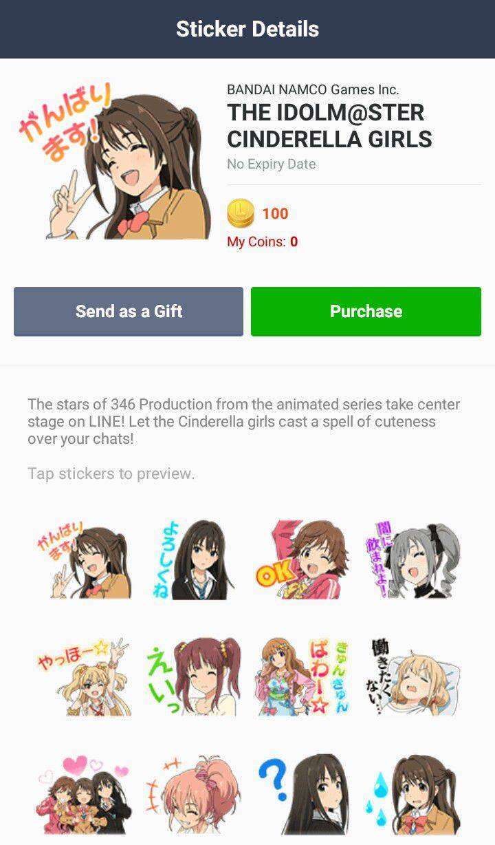 Meramaikan jajajaran stiker dalam aplikasi Line, Bandai Namco baru saja merilis stiker set dari seri The Idolm@ster Cinderella Girls. Berbagai karakter dari Cinderella Project tampil sebagai stiker dari aplikasi ini.