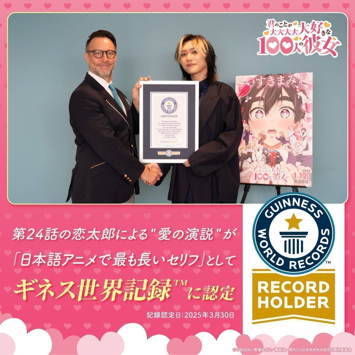 Seiyu asal Jepang Wataru Katoh berhasil mencetak rekor dunia berkat penampilannya sebagai Rentaro Aijo dalam anime The 100 Girlfriends Who Really, Really, Really, Really, Really Love You. Dalam episode ke-24 yang merupakan episode penutup musim kedua, ia membawakan monolog sepanjang 7.453 karakter bahasa Jepang. Monolog tersebut menggambarkan perasaan cinta Rentaro kepada seluruh 100 pacarnya dan langsung mencuri perhatian penonton.