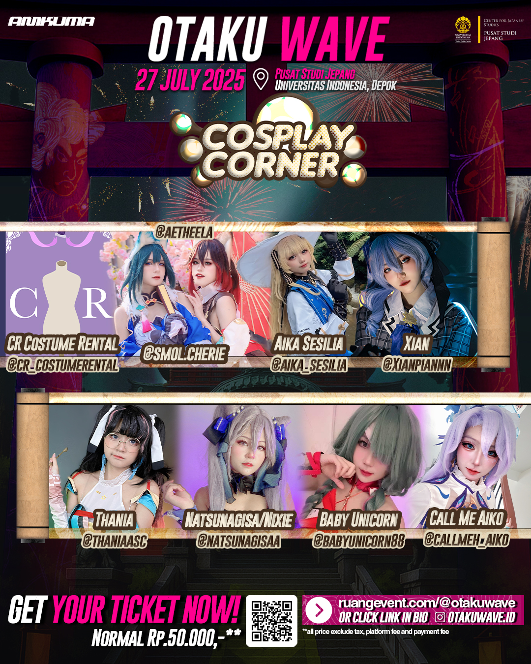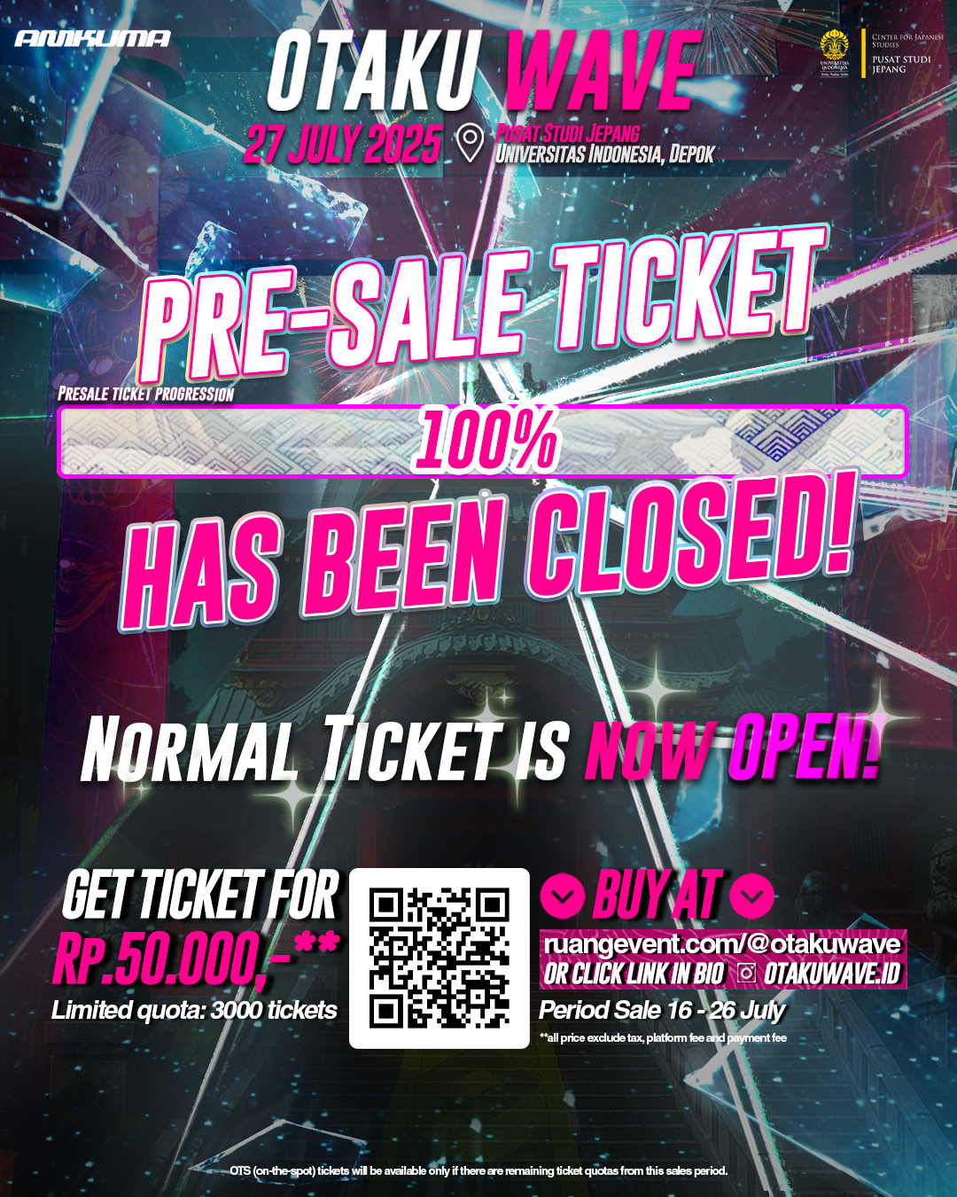 Dengan harga tiket hanya Rp50.000, Otaku Wave menjadi salah satu festival budaya Jepang paling ramah di kantong tahun ini. Tiket tersedia secara eksklusif melalui platform Ruangevent.com atau #Kaoreaders bisa langsung klik di sini. Acara ini juga didukung oleh Pusat Studi Jepang UI, serta puluhan komunitas dan pelaku industri kreatif dari seluruh Indonesia.