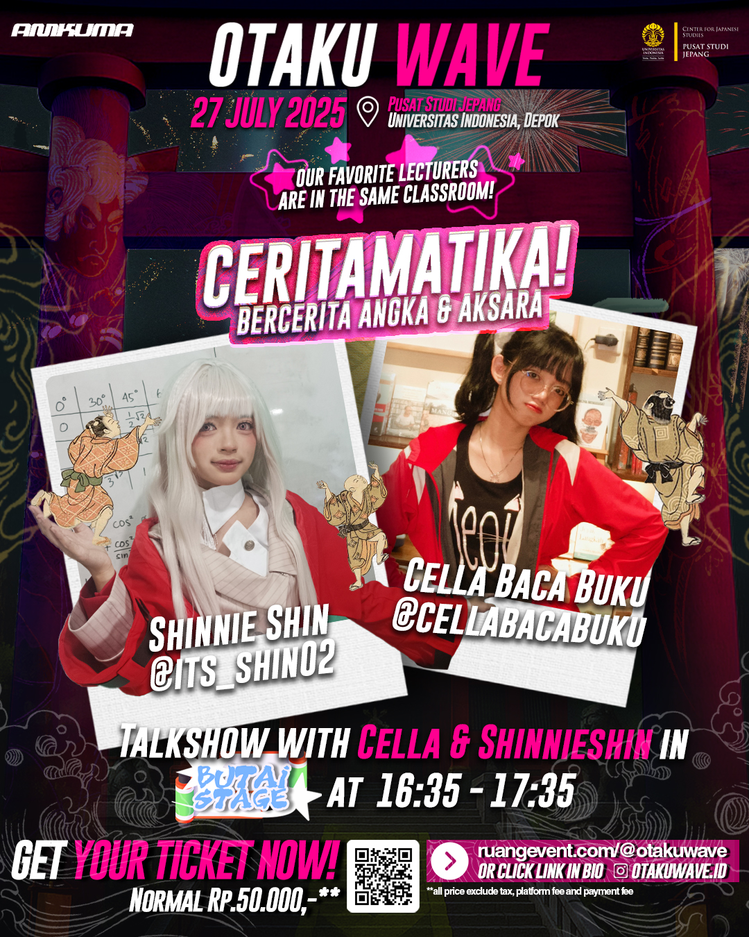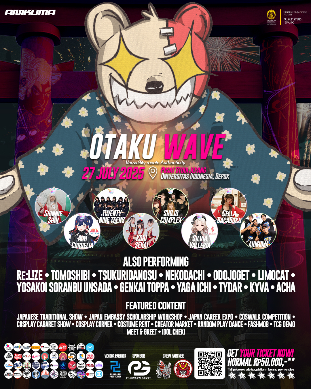 Gelombang budaya Jepang akan kembali menyapu kampus Universitas Indonesia melalui perhelatan Otaku Wave 2025, sebuah festival yang menghadirkan pertemuan antara dua sisi Jepang: tradisional dan modern. Bertempat di Pusat Studi Jepang UI, acara ini akan berlangsung pada Minggu, 27 Juli 2025. Mengusung tema “Versatility Meets Authenticity”, event ini lahir dari gagasan dan keinginan ANIKUMA dan Pusat Studi Jepang Universitas Indonesia untuk menyatukan warisan budaya klasik Jepang dengan ekspresi kreatif subkultur otaku masa kini, serta pengembangan karakter dengan edukasi dan karir bagi para pengunjung.