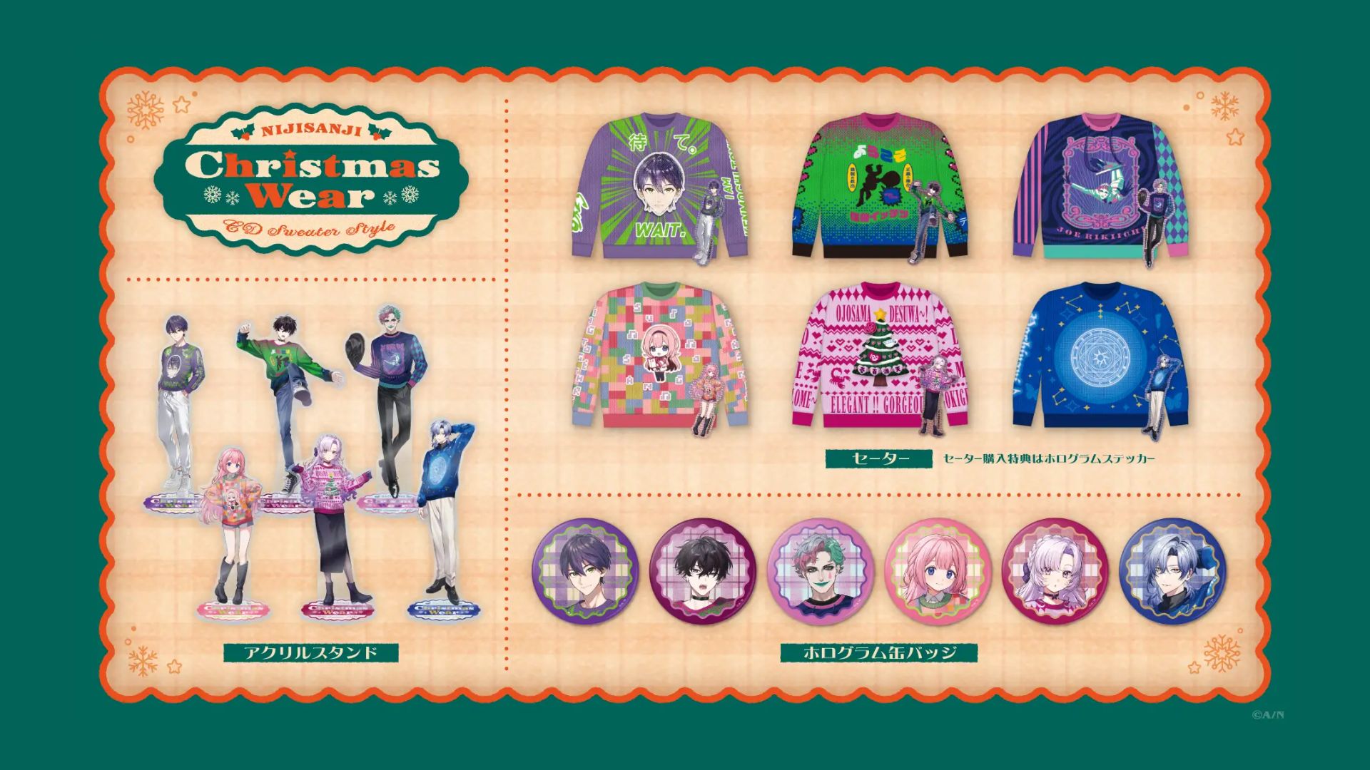 Lini produk merchandise NIJISANJI Christmas Wear ini terdiri dari tiga jenis barang utama. Pertama, ada sweater dengan desain unik yang dibanderol seharga 15.000 yen. Setiap pembelian sweater ini akan mendapatkan bonus berupa “Hologram Sticker” eksklusif. Kedua, ada acrylic stand seharga 1.650 yen per buah. Terakhir, ada juga hologram can badge seharga 700 yen. Ketiga jenis produk ini hadir dalam enam varian yang berbeda, menampilkan para Liver yang berpartisipasi.