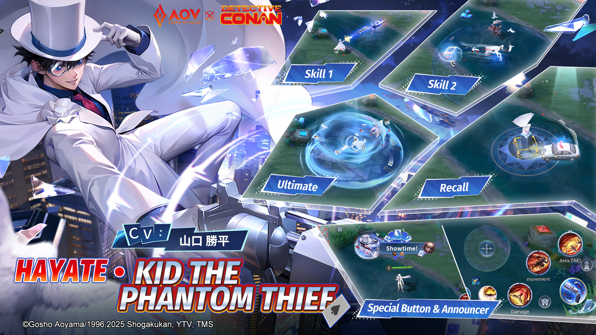- Kid The Phantom Thief hadir sebagai Hayate: Hayate akan menjelma sebagai Kid the Phantom Thief, sang pesulap malam penuh gaya rival dari Conan Edogawa. Efek skill-nya dihiasi kartu yang meledak dan berubah menjadi merpati dan bunga mawar. Sementara skill ultimate-nya menghujani arena dengan kartu tantangan, ditutup dengan aksi salto di udara yang elegan, khas sang pencuri legendaris. Hayate juga akan menunjukkan animasi recall yang menampilkan aksi pelarian yang dramatis ciri khas Kid. Kolaborasi skin ini akan hadir mulai 8-31 Agustus 2025