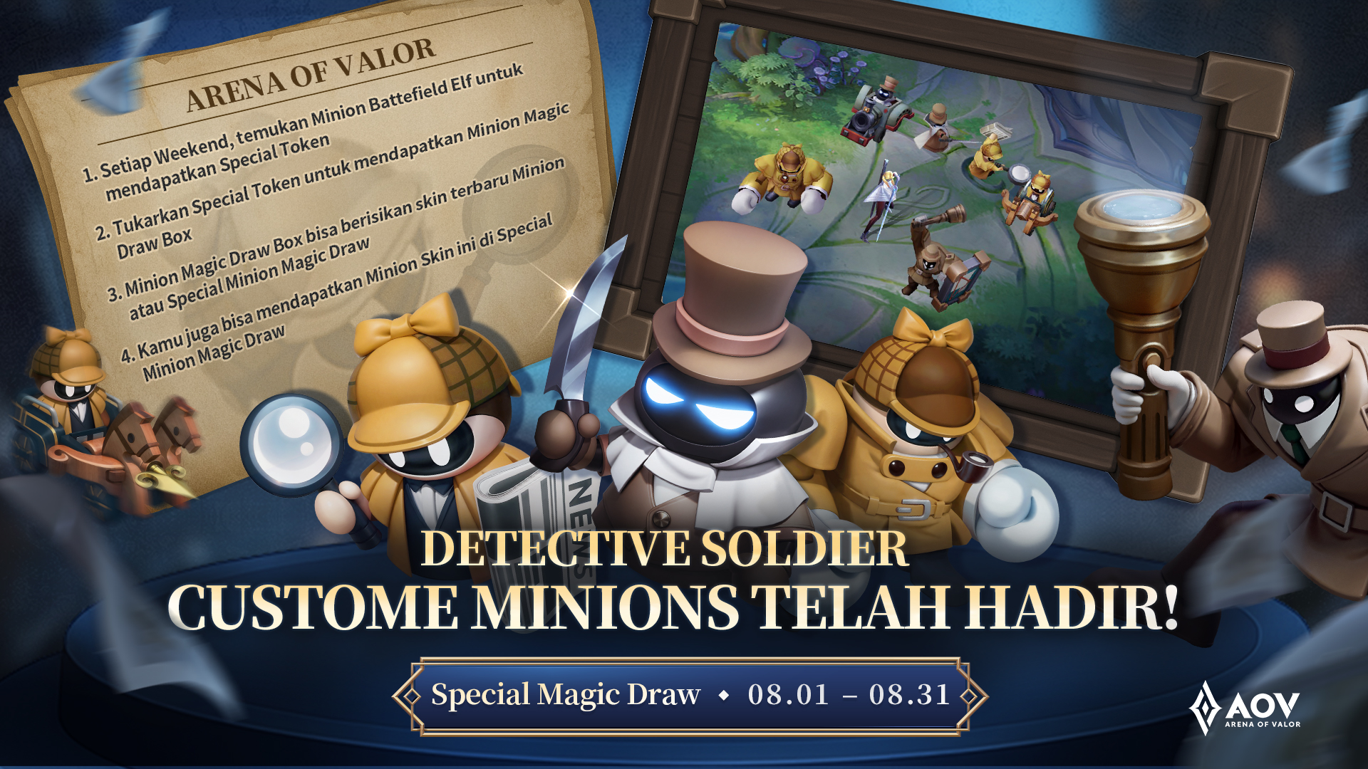 Kolaborasi AOV x Detective Conan juga menghadirkan minion bergaya detektif yang menggemaskan lengkap dengan topi khas penyelidik dan kaca pembesar. Pemain bisa mengoleksi minion detektif edisi terbatas ini hanya dengan mengikuti Magic Draw atau dengan menukar badge event. Pemain dapat menambah keseruan dalam bertanding di dunia.