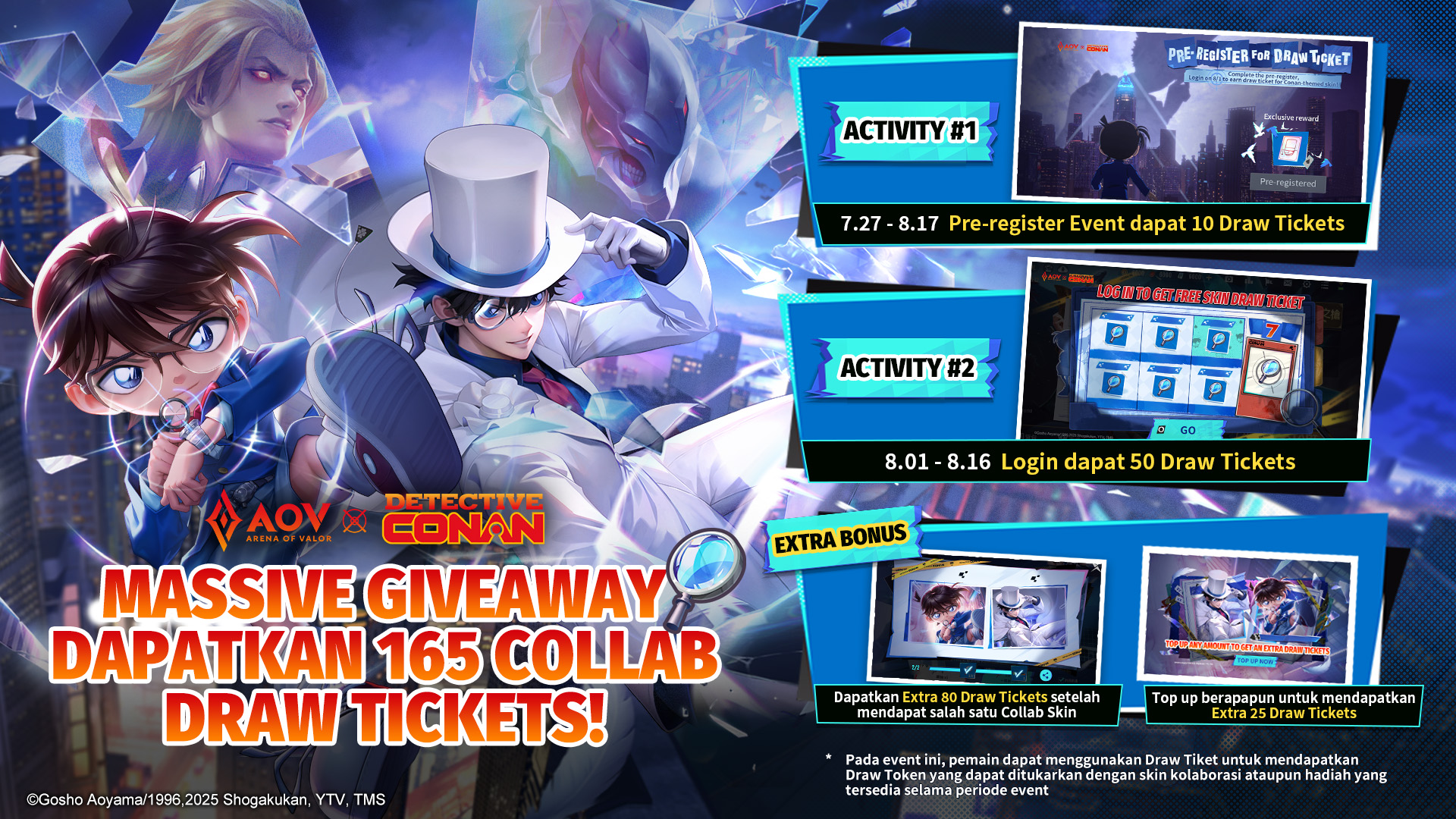 Dalam kolaborasi kali ini, AOV juga ingin memberikan berbagai apresiasi kepada para pemainnya melalui beragam hadiah in-game yang melimpah! Pemain bisa mendapatkan 215 draw ticket secara gratis hanya dengan menyelesaikan serangkaian misi dari event spesial. Ticket Draw bisa digunakan untuk menukar emoji, battle effect, frame, dan avatar. Bahkan, pemain juga memiliki peluang mendapatkan skin eksklusif Conan Edogawa dan Kid The Phantom Thief hanya dengan menukar draw ticket.