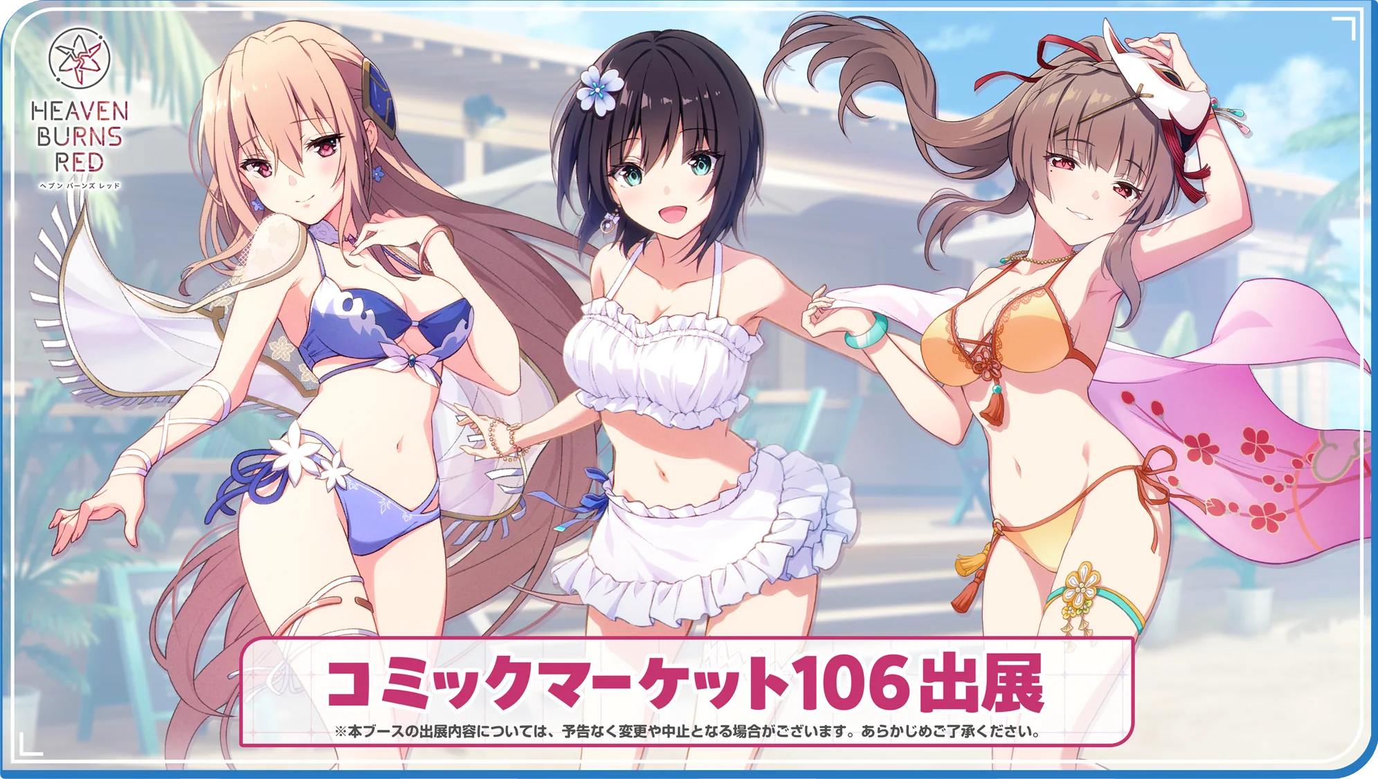 WFS dan Visual Arts telah mengumumkan bahwa mereka akan berpartisipasi dalam acara Comic Market 106. Mereka akan menghadirkan sebuah booth untuk aplikasi smartphone populer mereka, game Heaven Burns Red. Acara ini akan digelar pada tanggal 16 dan 17 Agustus 2025 di Tokyo Big Sight. Booth yang berlokasi di South Hall 4 No. 2521 ini akan diisi dengan berbagai konten menarik.