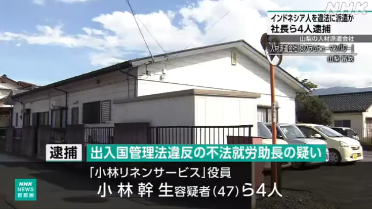 Empat orang, termasuk presiden direktur sebuah perusahaan jasa tenaga kerja di Prefektur Yamanashi, resmi ditangkap. Mereka diduga memaksa pekerja asing untuk bekerja di bidang yang tidak sesuai dengan izin tinggal mereka. Salah satunya, tiga pekerja Indonesia yang seharusnya bekerja di sektor pertanian, justru dialihkan ke sebuah pabrik laundry. Kasus ini langsung dikategorikan sebagai pelanggaran Undang-Undang Imigrasi Jepang.