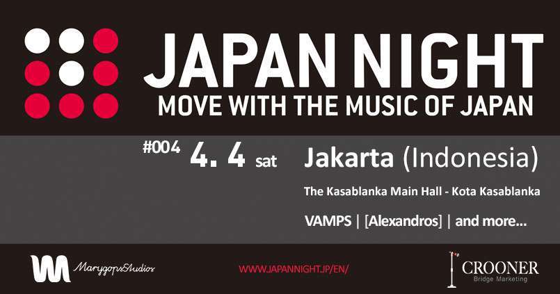 JAPAN NIGHT – MOVE WITH THE MUSIC OF JAPAN – hari ini mengumumkan bahwa konser pertama akan diadakan pada bulan April 2015 mendatang di Indonesia, mendatangkan beragam band Jepang kenamaan langsung dari Tokyo ke Jakarta. JAPAN NIGHT akan tetap menjadi konser/festival musik Jepang papan atas di Indonesia, dijadwalkan pada tanggal 4 April 2015 di The Kasablanka – Kota Kasablanka Mall Jakarta.