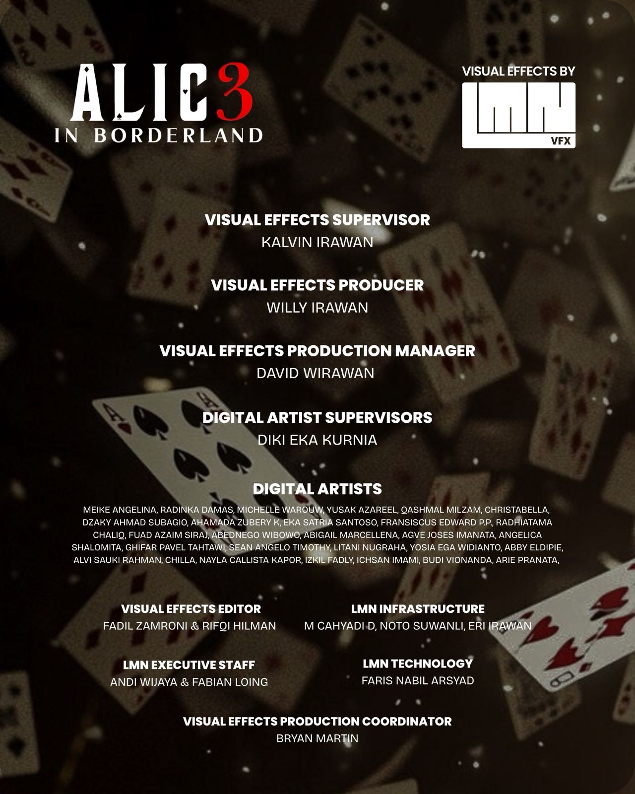 Rupanya, terdapat kontribusi penting dari Lumine Studio atau LMN VFX, studio asal Jakarta, Indonesia, yang dipercaya menjadi bagian dari tim VFX Alice in Borderland Season 3. LMN VFX mengerjakan sejumlah adegan dalam Episode 5 dan Episode 6, di mana mereka berhasil memperkuat atmosfer khas Borderland melalui efek visual yang selaras dengan intensitas cerita.