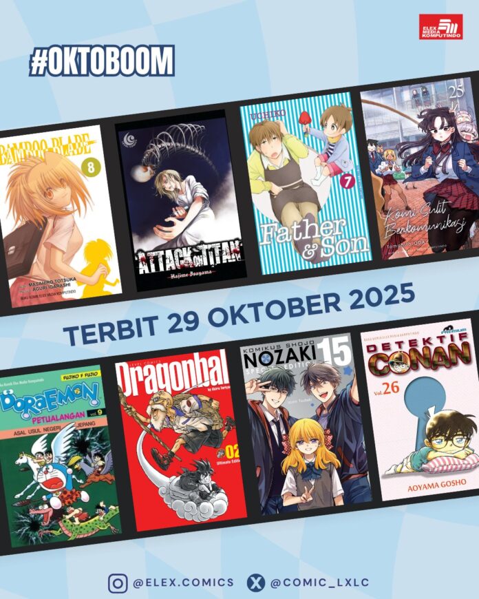 Melalui akun media sosialnya, penerbit Elex Media Komputindo memberikan bocoran mengenai sejumlah komik yang rencananya akan diterbitkan pada minggu kelima atau terakhir bulan Oktober 2025. Beberapa judul ada yang merupakan seri atau volume baru ataupun seri yang diterbitkan ulang. Jika tidak ada halangan, maka komik-komik ini akan terbit pada tanggal 29 Oktober 2025. Inilah bocoran komik Oktober 2025 (minggu kelima/terakhir):