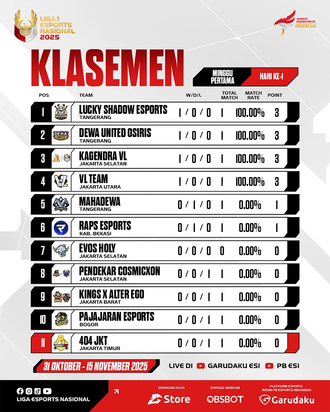 Hasil akhir di papan klasemen sementara Liga 1 diraih oleh Lucky Shadow Esports di posisi puncak, disusul oleh Dewa United Osiris di #2. Sementara untuk duo VL, Kagendra VL berada di posisi ketiga dan VL team berada di posisi keempat. Raps Esports harus puas di hari pertama dengan berada di posisi #6, Mahadewa berada di posisi #5 karena harus berbagi poin di hari pertama.