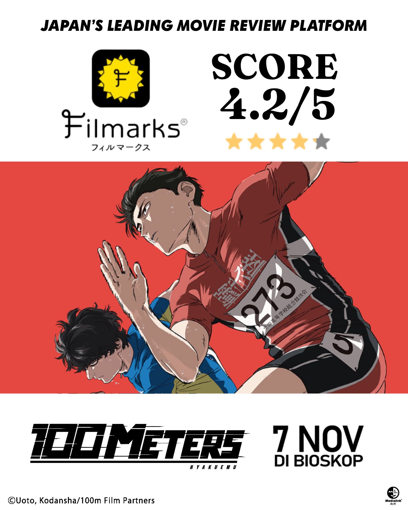 CBI Pictures resmi merilis film anime 100 Meters (Hyakuemu) di sejumlah gerai bioskop Indonesia pada 7 November 2025. Film ini diadaptasi dari komik karya Uoto dan disutradarai oleh Kenji Iwaisawa, sosok di balik ON-GAKU: Our Sound. Setelah sebelumnya tayang di Jepang pada 19 September 2025 dan meraih posisi ke-8 di box office pada pekan perdananya, 100 Meters akhirnya telah resmi tayang di sejumlah jaringan bioskop seperti CGV Cinemas Indonesia dan Cinepolis Indonesia.