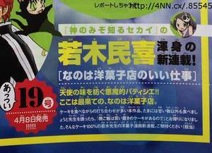 Diumumkan di Majalah Mingguan Shonen Sunday pada hari rabu lalu bahwa pengarang komik The World God Only Knows Tamiki Wakaki, akan meluncurkan komik terbarunya di majalah shounen sunday edisi 19 yang akan terbit pada tanggal 8 April mendatang. Judul komik terbarunya adalah Nanoha Yogishiten no Ii Shigoto (A Great Job at Nanoha Western Sweets Shop).
