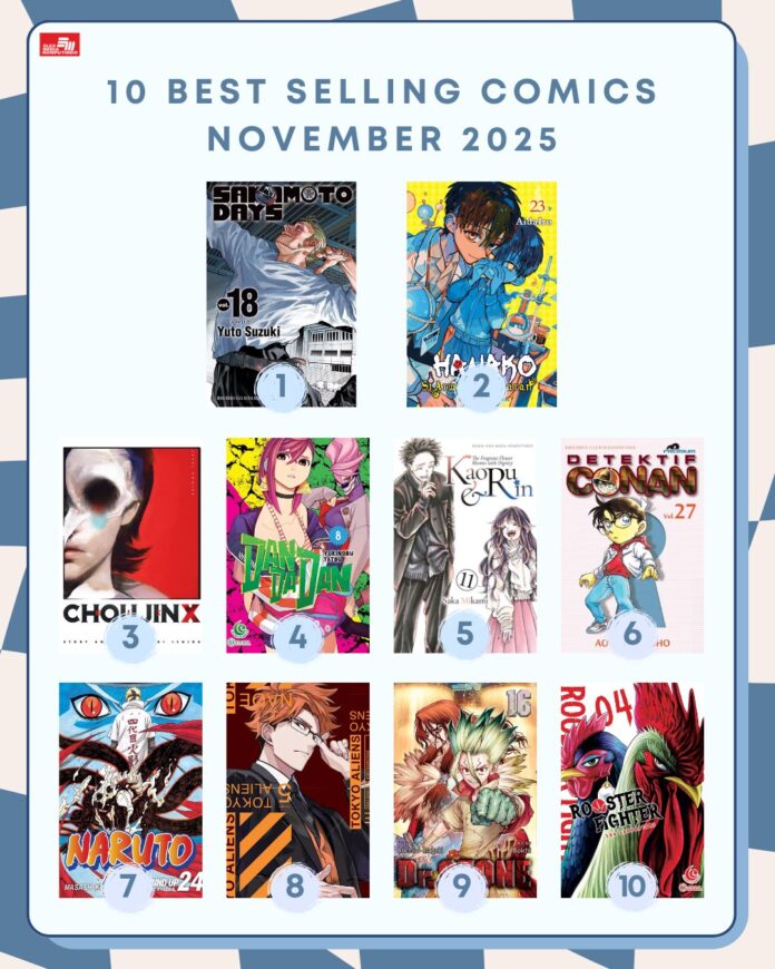 Melalui akun media sosialnya, penerbit Elex Media Komputindo telah memublikasikan judul-judul komik best seller terbitan mereka selama bulan November 2025. Inilah komik-komik Best Seller Elex Media November 2025: