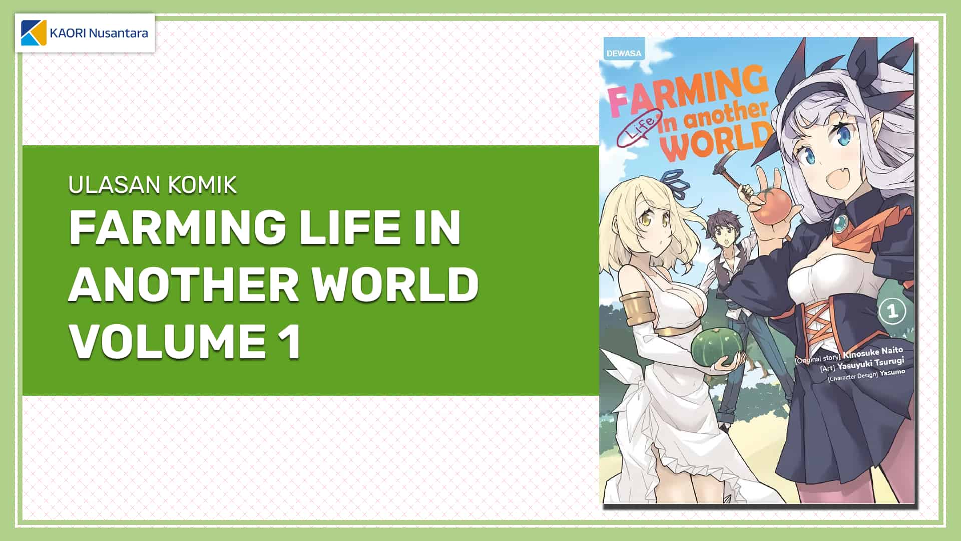 Kalau dibilang sebenarnya seri ini tidak ada hal yang spesial. Ini hanyalah sebuah seri isekai standar mengenai seseorang yang memiliki kekuatan spesial dan mempunyai harem. Tapi di situlah letak menariknya, sama seperti anime Shikkakumon, tidak perlu untuk membuat sesuatu yang heboh atau dalam. Selama sederhana dan dapat diikuti, premis isekai yang terasa copy-paste pasti akan terasa menarik. Itulah bumbu khas dari seri Farming Life in Another World! Tanpa terkecuali komik ini terutama volume pertamanya. Komik ini memiliki bobot dan fokus utama pada narasi. Hal sekecil apapun cukup sering dibahas baik itu bagaimana orang lain berpikir hingga lingkungan sekitarnya bereaksi. Karena itu, cerita dan karakternya terasa seperti hidup.