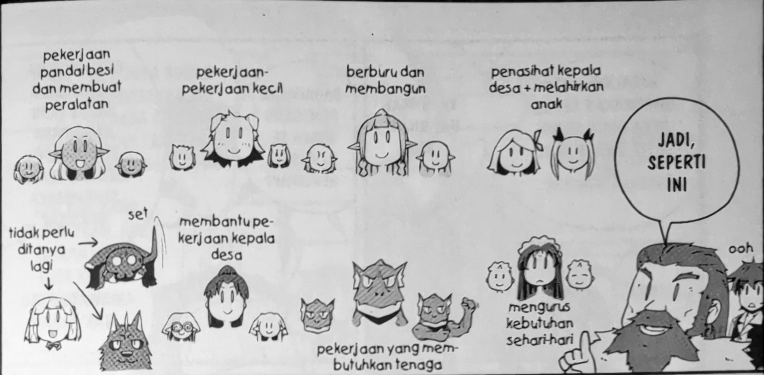 Namun bobot utama volume ini terfokus pada bagaimana pak kades harus merencanakan desa ketiganya sekaligus memastikan penduduknya merasa nyaman tinggal di desa tersebut. Pasalnya dirinya juga terkejut akan beberapa ras yang baru ia temui dan bagaimana caranya agar mereka merasa tercukupi. Jujur saja, semakin lama, cerita seri ini terasa lebih ke arah pembangunan daripada bagaimana hidup sederhana sebagai petani. Tapi ya kita sendiri sudah bisa melihat transisi cerita sederhana menjadi pembangunan sejak volume kedua. Walau saya suka, tapi membaca banyak teks terkadang membuat saya sedikit kesulitan untuk fokus apalagi dengan gaya baca saya yang selalu mengutamakan speed reading. Namun beruntunglah topik pembangunannya pun tidak hanya sekedar membangun tapi ada dasar mengapa harus membangun itu dengan bumbu fantasi.
