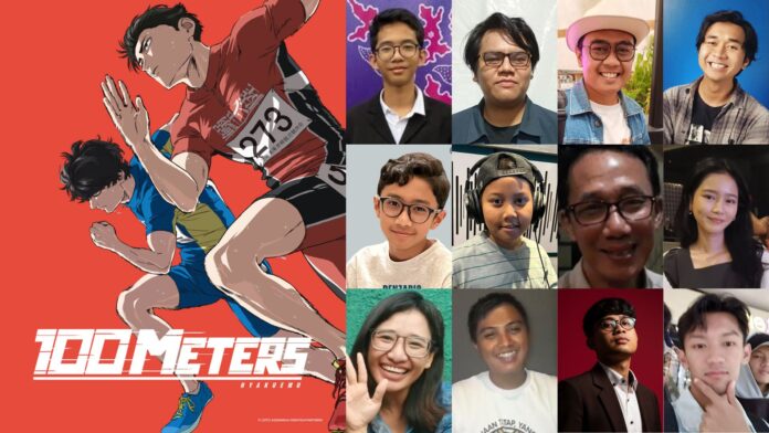 Dubbing berbahasa Indonesia untuk film anime 100 Meters ini sudah tersedia di Netflix sejak tanggal 31 Oktober 2025. Dubbing Indonesia ini digarap oleh studio Fresto dengan Beatrix Renita sebagai pengarah dialog. Berikut adalah para jajaran seiyu-nya: