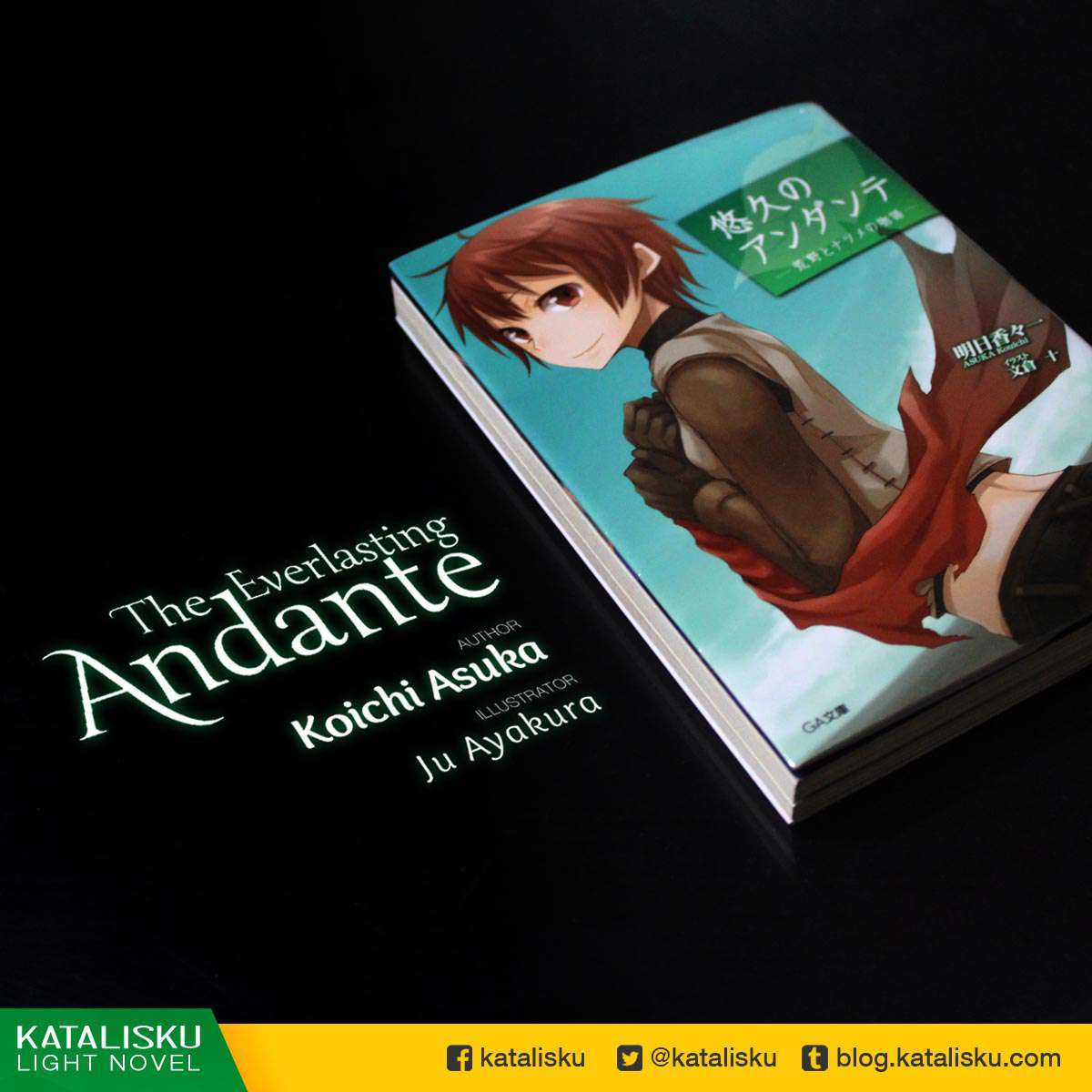 Melalui akun Facebooknya, penerbit Katalis Pustaka akan menerbitkan satu lagi novel asal Jepang yang kali ini bertajuk The Everlasting Andante (Yuukyuu no Andante). Belum ada informasi lebih lanjut mengenai jadwal perilisan novel ini maupun harga dari novel terbaru terbitan Katalis Pustaka ini.Ditulis oleh Koichi Asuka dengan ilustrasi oleh Ju Ayakura. The Everlasting Andante bercerita tentang seorang gadis kecil bernama Natsume yang karavannya dibinasakan oleh makhluk mengerikan yang dikenal sebagai ‘mushi’.