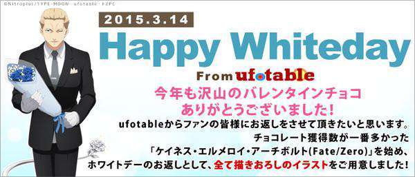 Akhir pekan ini memasuki tanggal 14 Maret, artinya hari ini adalah peringatan hari White Day. White Day merupakan hari dimana seseorang memberikan balas budi kepada pasangannya yang telah memberikan coklat pada hari Valentine sebulan yang lalu. Meramaikan perayaan White Day ini, pihak studio animasi Ufotable membuat ilustrasi khusus ucapan White Day.