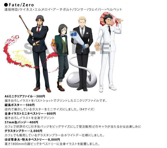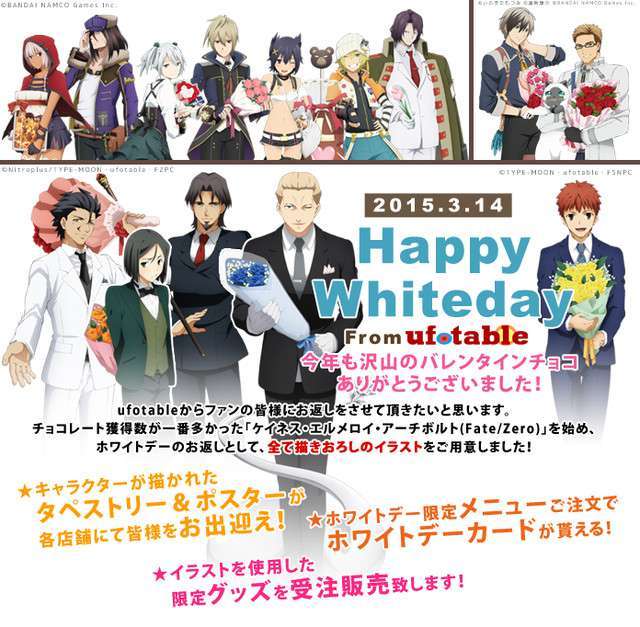 Merayakan White Day, gerai Ufotable Cafe di Jepang akan menyelenggarakan promo khusus. Selama tanggal 15 Maret hingga 22 Maret nanti, akan dijual beberapa pernik dengan ilustrasi khusus White Day besutan Ufotable. Pernik tersebut dijual mulai dari harga 300 Yen (sekitar Rp36.000) hingga yang paling mahal dengan harga 8000 Yen (sekitar Rp960.000). Selain menjajakan pernik, Ufotable Cafe juga akan menghidangkan menu spesial yang dapat diperoleh mulai dari harga 500 Yen (sekitar Rp60.000) hingga 800 Yen (sekitarRp96.000).