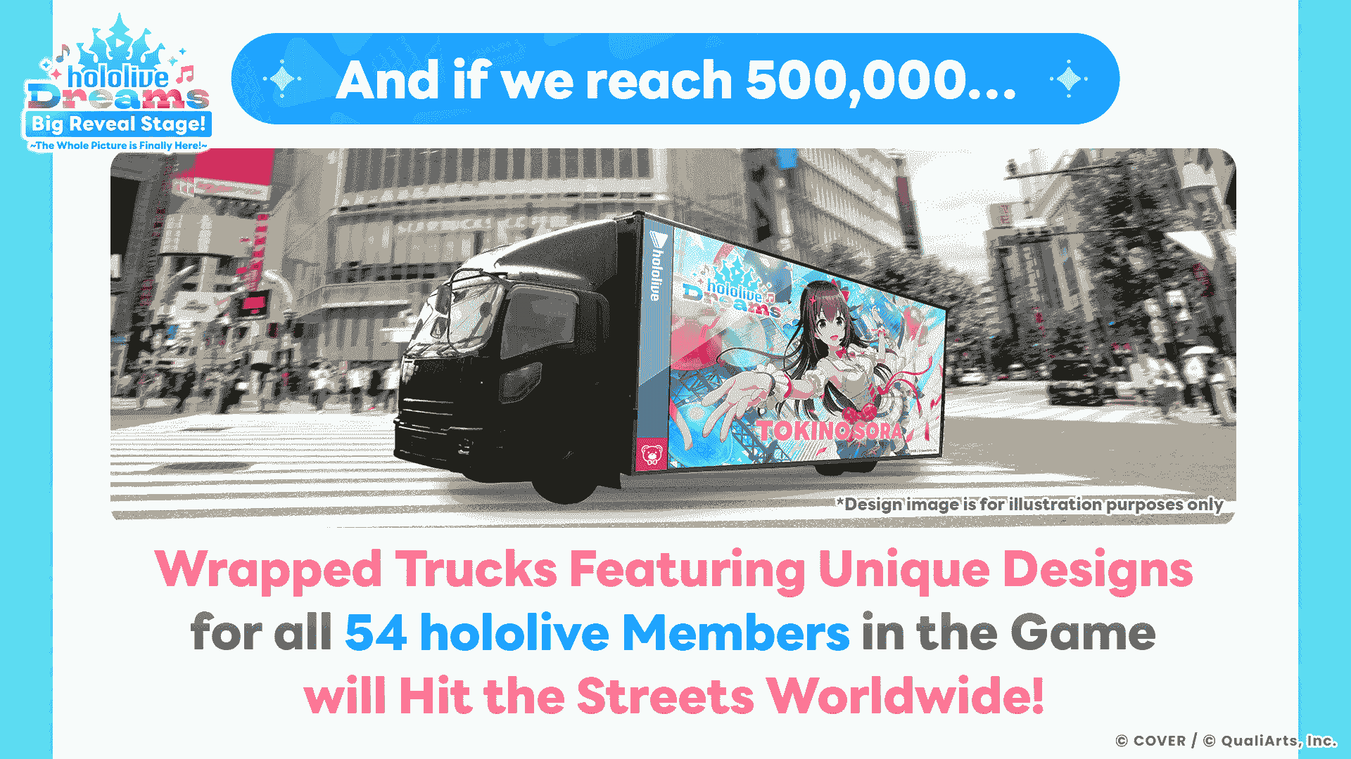 Lebih mengejutkan lagi, apabila jumlah pendaftar global berhasil melampaui angka 500 ribu pengguna, pihak pengembang berjanji akan mengerahkan armada truk iklan berdesain khusus. Truk iklan yang akan menampilkan 54 anggota hololive tersebut dijadwalkan untuk berkeliling meramaikan jalanan di berbagai kota besar di seluruh dunia.