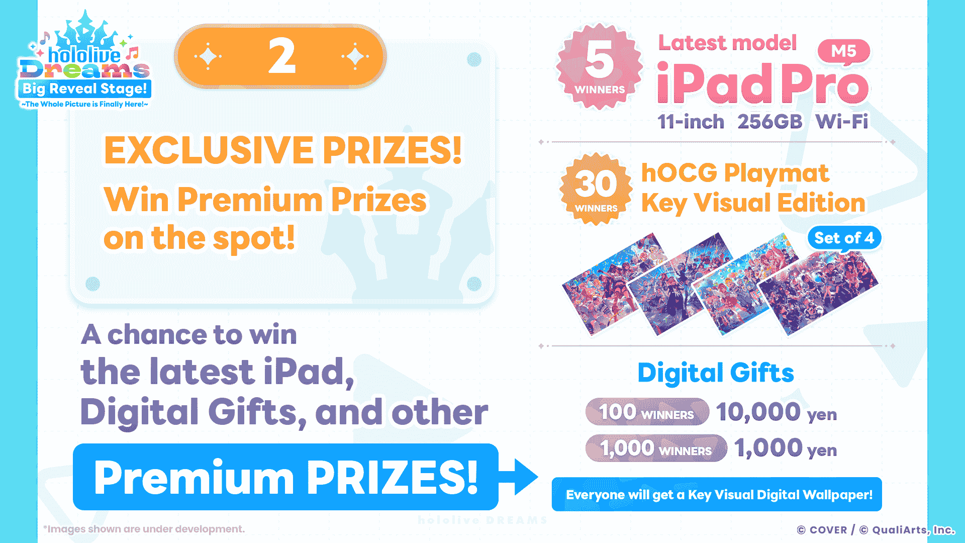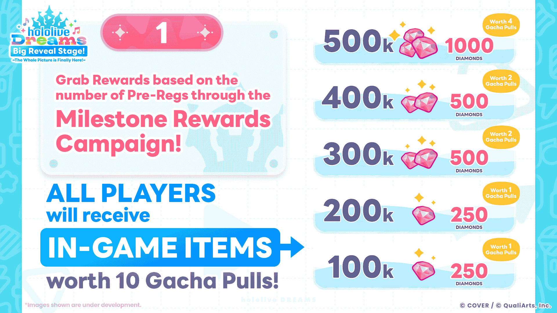 Untuk merayakan momen bersejarah peluncuran ini, QualiArts dan COVER Corporation telah menyiapkan tiga kampanye bertabur hadiah premium yang bisa langsung diikuti oleh calon pemain. Kampanye pertama adalah Milestone Rewards, di mana seluruh pemain akan menerima berbagai barang (item) in-game secara cuma-cuma berdasarkan jumlah total pendaftar di seluruh dunia. Jika target pencapaian tertinggi berhasil ditembus, setiap pemain berhak mendapatkan hadiah yang setara dengan sepuluh kali tarikan gacha.