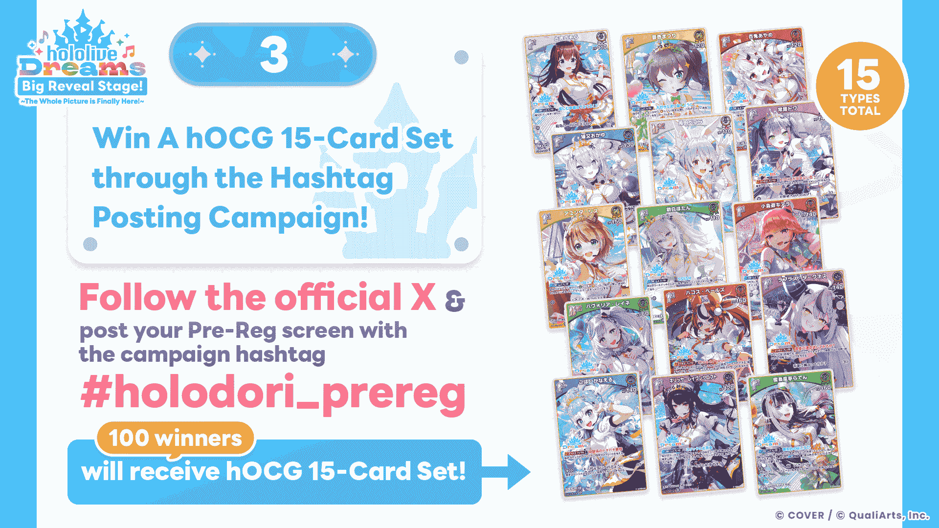 Sementara itu, kampanye ketiga secara khusus menargetkan para kolektor pernak-pernik fisik. Dengan cara mengikuti akun media sosial X resmi mereka dan membuat postingan menggunakan tagar khusus #holodori_prereg, sebanyak seratus orang pemenang beruntung akan dipilih secara acak untuk mendapatkan set eksklusif. Set ini berisi 15 lembar kartu fisik dari game hololive OFFICIAL CARD GAME (hOCG) yang pastinya akan menjadi barang incaran langka.