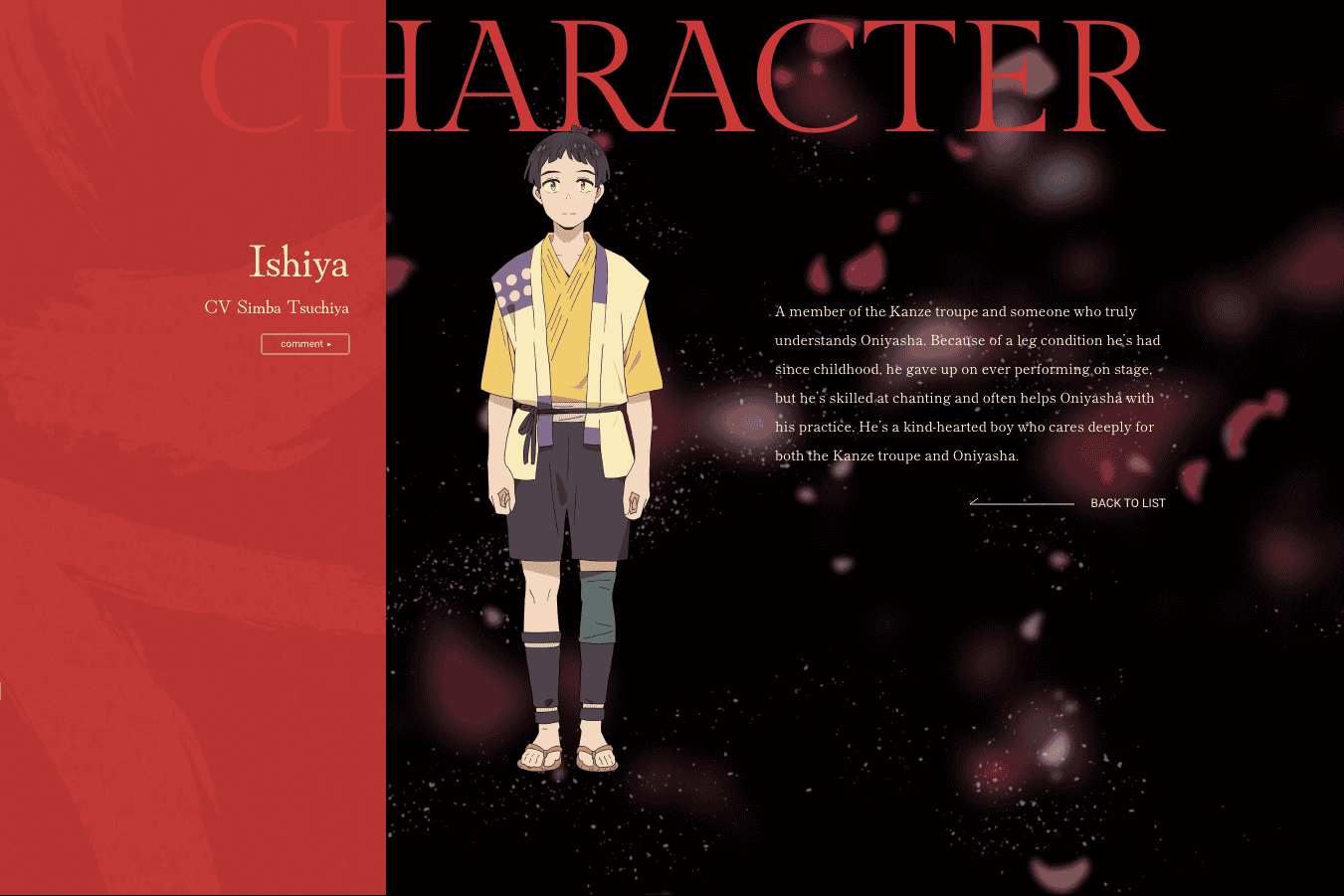 Selain itu, terdapat Shimba Tsuchiya yang berperan sebagai Ishiya, seorang anggota rombongan Kanze yang sangat memahami Oniyasha. Meskipun Ishiya harus menyerah untuk tampil di panggung karena kondisi kakinya sejak kecil, ia sangat ahli dalam melantunkan nyanyian dan memiliki hati yang baik. Maaya Uchida, pengisi suara yang populer lewat Chainsaw Man, turut hadir sebagai Kogane, sahabat Oniyasha di tepi sungai yang suka mengarang cerita konyol dan diam diam memiliki ketertarikan pada tarian.