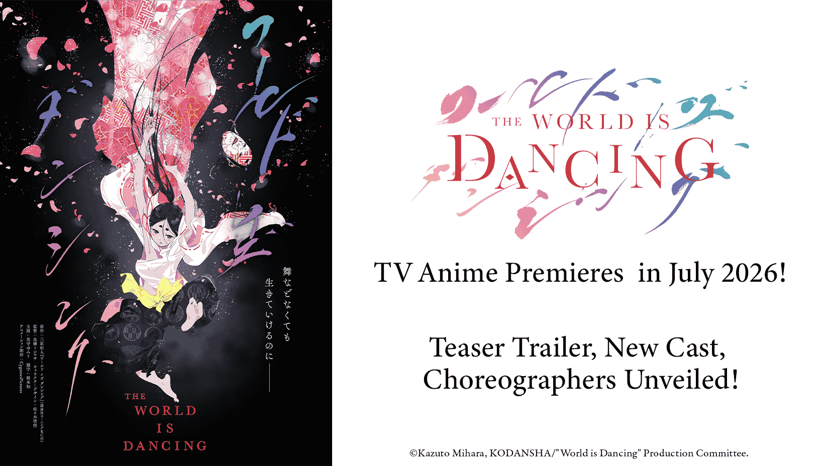 Pesona seni tradisional panggung Jepang selalu memiliki ruang istimewa untuk dieksplorasi menjadi sebuah mahakarya animasi yang memanjakan mata. CyberAgent dan Shochiku secara resmi telah mengumumkan bahwa proyek kolaborasi mereka, Anime World Is Dancing, akan mulai tayang pada bulan Juli 2026 mendatang. Pengumuman berskala besar yang dirilis pada hari Selasa ini juga dibarengi dengan peluncuran sebuah video teaser trailer perdana ke publik. Melalui cuplikan singkat tersebut, penonton disuguhkan dengan visual sejarah yang memukau, perkenalan jajaran pengisi suara baru beserta komentar hangat mereka, hingga daftar tokoh kreator papan atas yang bekerja penuh dedikasi di balik layar animasinya.