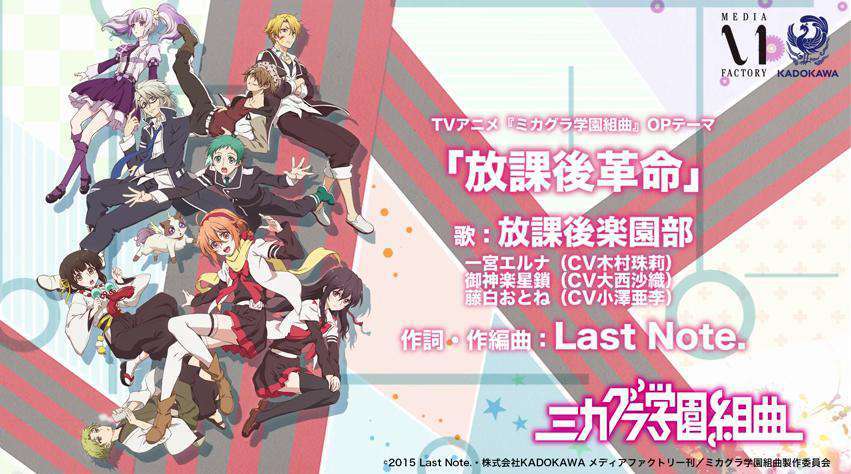 Menjelang dirilisnya anime Mikagura School Suite, kini situs resmi dari anime tersebut telah merilis mempublikasikan cuplikan dari lagu pembuka dan penutup dari anime ini yang masing-masing berjudul “Houkago Kakumei” (After School Revolution) dan “Rakuen Fanfare” (Paradise Fanfare) yang keduanya dibawakan oleh Houkago Rakuenbu, berikut sebuah character song “Rakuen Stride” (Paradise Stride) yang dibawakan oleh Juri Kimura.