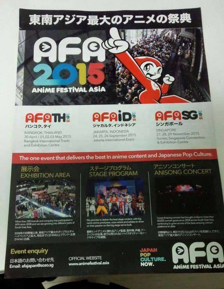 Setelah mengalami simpang siur mengenai kabar kejelasan kapan tanggal penyelenggaraan AFAID (Anime Festival Asia Indonesia) tahun ini, melalui akun media sosial resminya akhirnya pengumuman tersebut dimuat. Berdasarkan pengumuman tersebut, disebutkan bahwa AFAID 2015 akan digelar pada tanggal 24-26 September 2015.