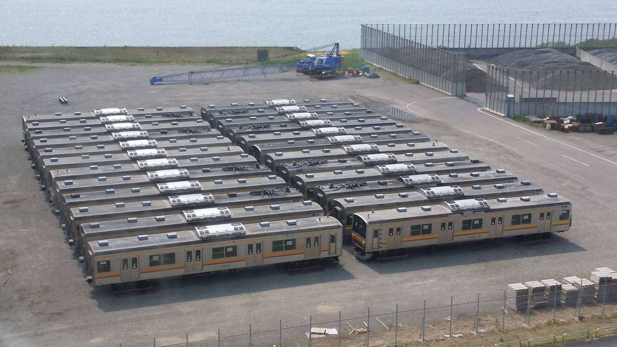 Foto dari Yukihiko Inoue ini menampilkan kondisi KRL JR 205 yang sudah ada di Niigata, Jepang dan siap dikirimkan ke Indonesia. Terpantau sudah ada 30 unit (5 set x 6 kereta) yang tersusun rapi dan tinggal menunggu pengiriman.