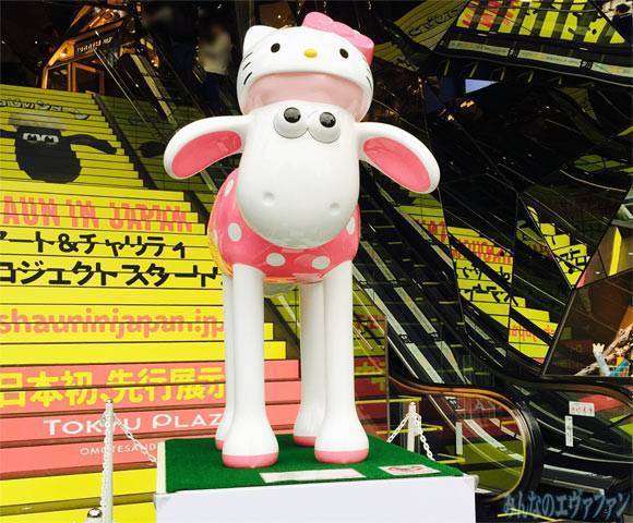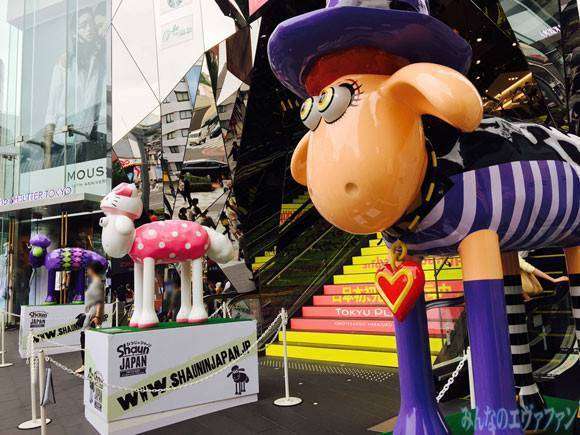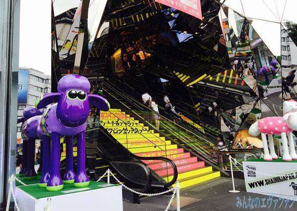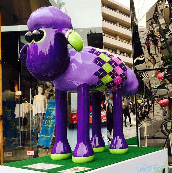 Dalam rangkaian gelaran tur pameran amal yang bertajuk Shaun in Japan dari animasi stop-motion Shaun the Sheep ini, gerai Tokyu Plaza yang terletak di distrik Harajuku menampilkan beberapa patung Shaun the Sheep karya pasangan suami istri Hideaki Anno serta Moyocco Anno. Hideaki Anno yang cukup dikenal dengan karya animasinya yakni Neon Genesis Evangelion ini membuat sebuah patung Shaun dengan balutan warna ala robot raksasa Evangelion yang dinaiki oleh Shinji Ikari. Patung ini ia desain dengan bantuan dari Ikuto Yamashita sang desainer mecha dari seri anime Neon Genesis Evangelion.