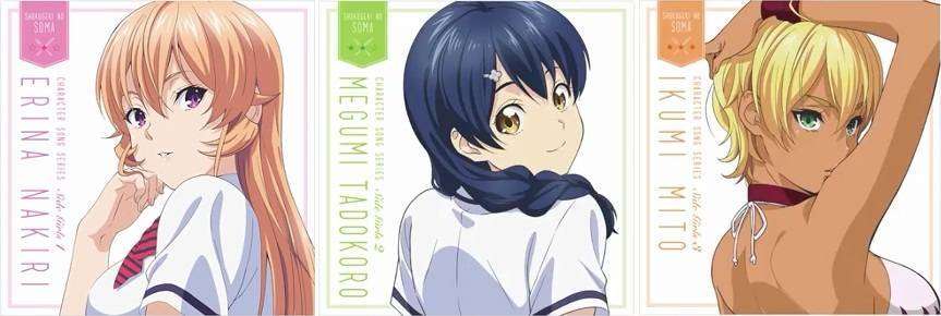 Shokugeki no Souma akan merilis CD karakter yang akan menampilkan berbagai lagu yang dibawakan oleh enam karakter yang terdapat pada seri animenya. Bagian pertama perilisan CD karakter Shokugeki no Souma akan menampilkan tiga karakter perempuan, yakni Naniki Erina (Risa Taneda), Megumi Tadakoro (Minami Takahashi), Ikumi Mito (Shizuka Ishigami), sedangkan bagian keduanya akan menampilkan tiga karakter laki-laki, yaitu Kojirou Shinomiya (Yuichi Nakamura), Takumi Aldini (Natsuki Hanae), dan Souma Yukihira (Yoshitsugu Matsuoka).