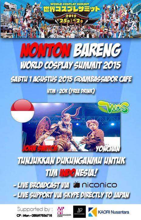 Bertempat di Ambassador Cafe, Bulungan, Jakarta Selatan, acara nonton bareng World Cosplay Summit 2015 akan diselenggarakan. Acara ini merupakan perhelatan nonton bareng resmi yang digelar atas undangan dari pihak WCS di Jepang. Nantinya pada nonton bareng tersebut akan dilakukan via livestreaming melalui jaringan NicoNico Live. Tidak hanya itu, pada hari tersebut juga akan diadakan sambungan via Skype dari Jakarta ke Jepang yang terhubung langsung dengan WCS di Nagoya.
