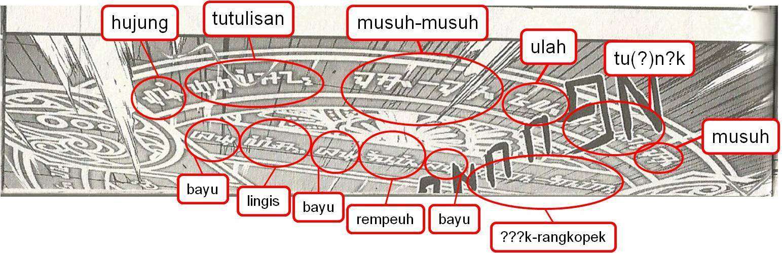 Setelah ditelusuri lebih lanjut, ternyata yang ditulis dalam lingkaran-lingkaran sihir di komik ini adalah penggalan dari sebuah jangjawokan atau semacam mantra yang dikenal oleh orang Sunda zaman dulu. Mantra yang satu ini dikatakan berfungsi untuk melindungi diri dari acaman perampok saat berjalan di hutan. Seperti inilah bacaan lebih lengkap dari mantra tersebut: