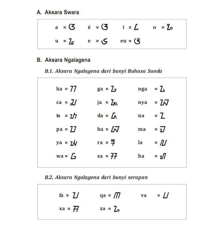 Aksara Sunda yang telah dibakukan dapat anda lihat dalam tabel di bawah. Simbol-simbol dalam aksara Sunda baku terdiri dari aksara swara (mewakili harkat vokal), aksara ngalagena (konsonan yang mengandung bunyi vokal /a/ kecuali diberi rarangkén yang mengubah bunyi vokalnya) baik yang berasal dari bunyi bahasa Sunda maupun bunyi serapan, rarangkén atau penanda vokalisasi, angka-angka, serta tanda baca yang diadaptasi dari sistem tulisan latin.
