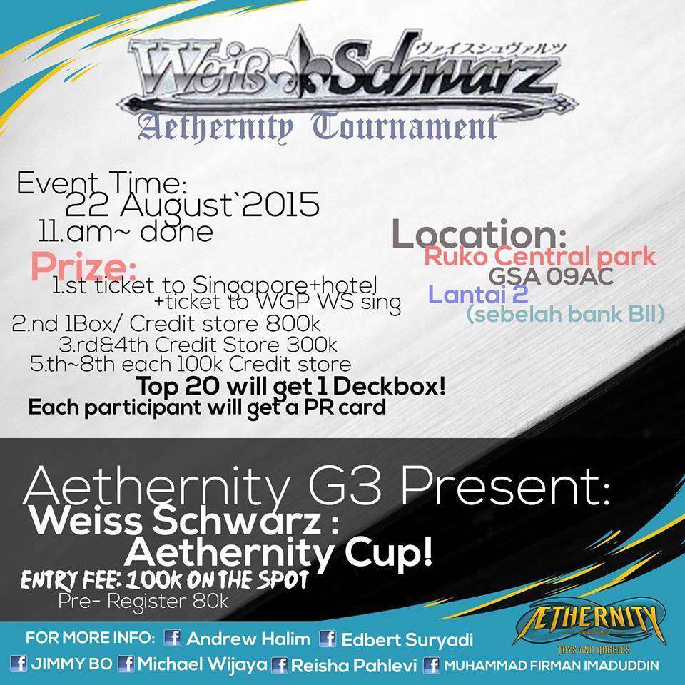 Kabar gembira bagi anda yang menggemari hobi bermain permainan kartu Weiss Schwarz. Salah satu toko hobi di Jakarta, Aethernity Good Guy Games akan menggelar WS Cup. Turnamen yang bertajuk Aethernity G3 WS Cup ini akan berlangsung pada hari Sabtu, 22 Agustus 2015 mendatang. Nantinya turnamen ini akan berlangsung mulai pukul 11.00 WIB.