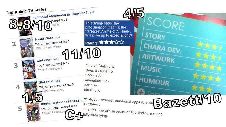 Sebenarnya saya baru beberapa tahun ini meninggalkan penilaian dengan skor. Dulu pun, saya suka memberi-beri skor kepada anime-anime yang sudah saya tonton. Kemudian di tahun 2011, ada sebuah kasus yang mulai menggoyahkan ‘kepercayaan’ saya pada sistem skoring. Saya tidak langsung meninggalkan penilaian dengan skor karenanya, tapi saya jadi mulai terpikir bahwa tidak semua hal bisa saya nilai dengan skor, sebelum secara bertahap kemudian saya menyerah sepenuhnya dari mempertahankan database skor untuk anime-anime yang sudah saya tonton (berlaku juga untuk komik-komik yang saya baca).