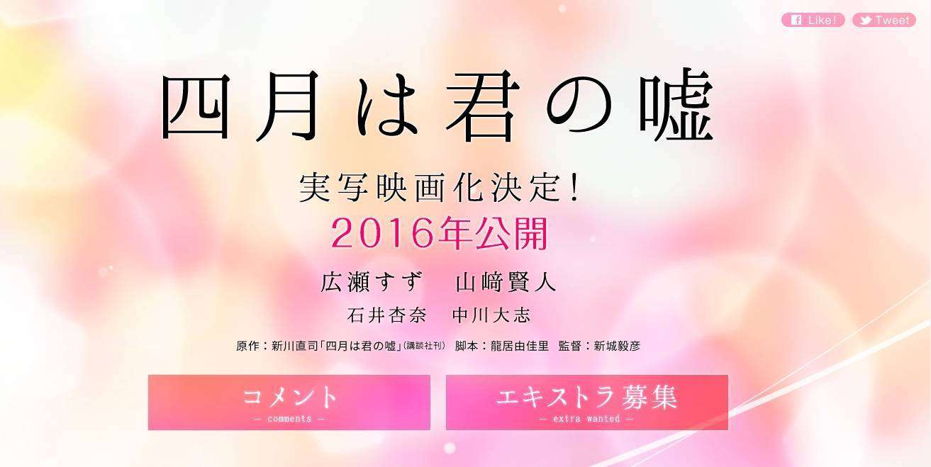 Adaptasi film live action dari seri komik Your Lie in April akan ditayangkan pada 2016 dan nama para pemerannya telah diumumkan.