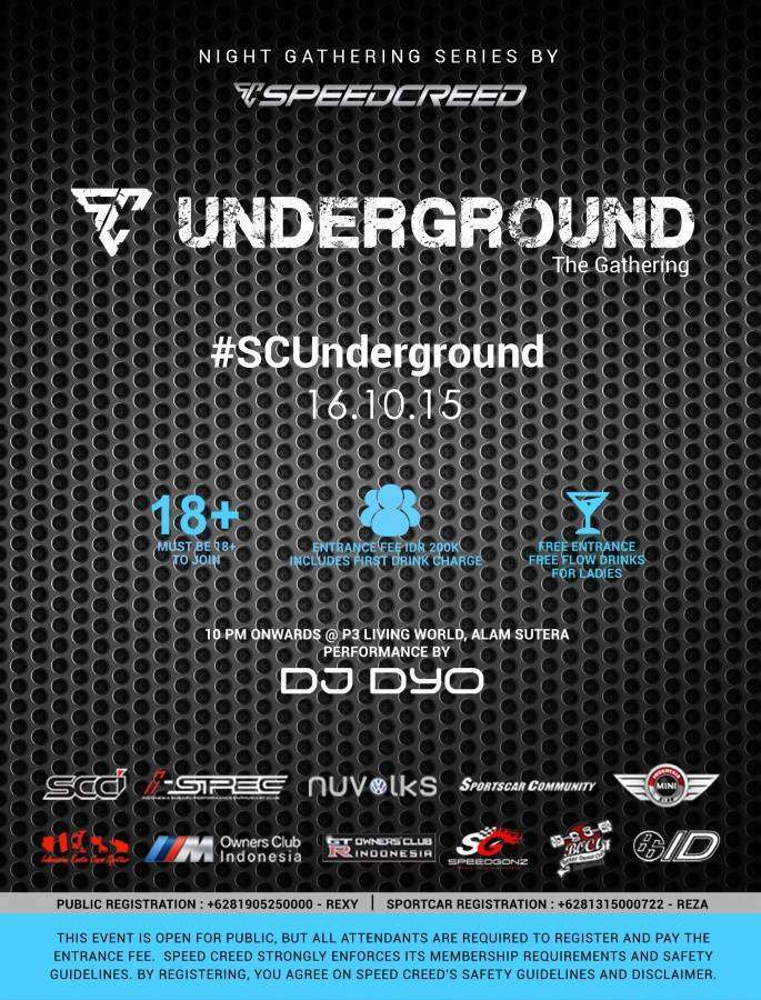 Lalu untuk Event #SCUnderground itu sendiri adalah sebuah Night Gathering Series para enthusiasist mobil sports car dan premium car berkumpul. Ini adalah kali kedua #SCUnderground diadakan. Untuk #SCUnderground kali ini, Speedcreed mengundang beberapa komunitas otomotif atau car enthusiasist di Jakarta, salah satunya adalah dari komunitas Ita Indonesia.