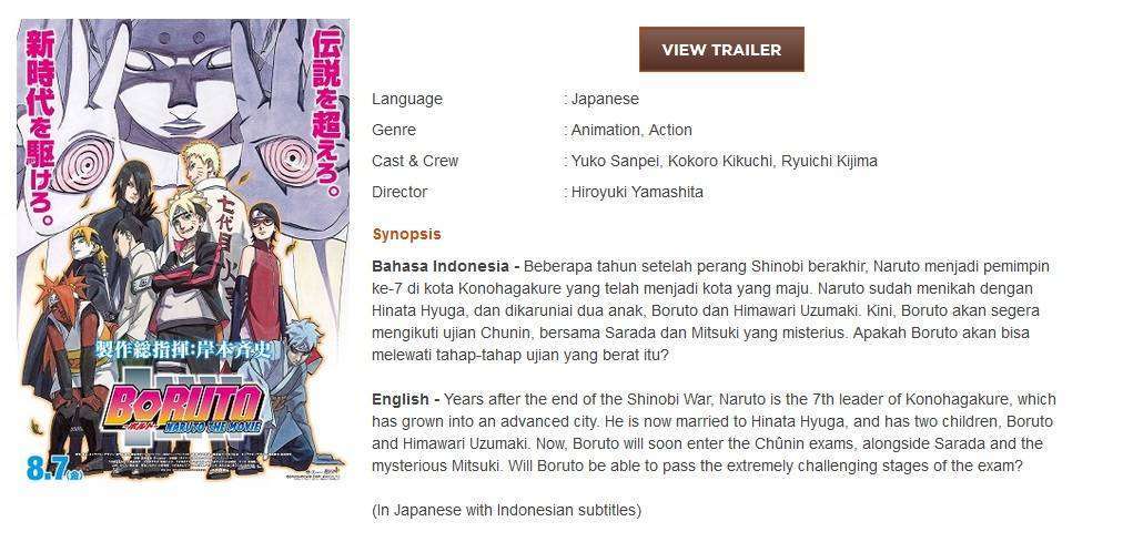 Jaringan bioskop Cinemaxx kini mengumumkan akan turut memutar film terbaru Naruto yang bertajuk Boruto: Naruto the Movie. Jika tidak ada halangan, maka film ini akan hadir mulai bulan November 2015.