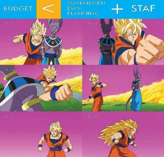 Contoh masalah tersebut seperti yang terjadi belum lama ini pada Dragon Ball Super episode 5. Dragon Ball adalah sebuah franchise besar yang sangat terkenal, sehingga tentu saja tidak mungkin proyek Dragon Ball Super ini menjadi proyek kecil-kecilan dengan dana yang sedikit. Episode 5 pun bukan episode dengan staf sembarangan, kursi animation director diduduki oleh salah satu animator terbaik Toei, Naoki Tate, serta diisi oleh animator handal seperti Ken Otsuka. Sayangnya, staf-staf seperti itupun tidak dapat melawan manajemen waktu yang berantakannya sudah keterlaluan, dan beginilah hasilnya :