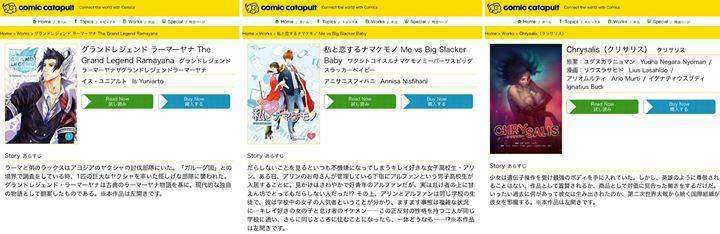 Majalah komik re:ON Comics melalui akun Facebooknya menyatakan bahwa tiga dari komik-komik mereka kini telah tersedia dalam Bahasa Jepang melalui penerbit digital Comic Catapult. Ketiga komik tersebut masing-masing adalah The Grand Legend Ramayana, Me VS Big Slacker Baby, dan Chrysalis.