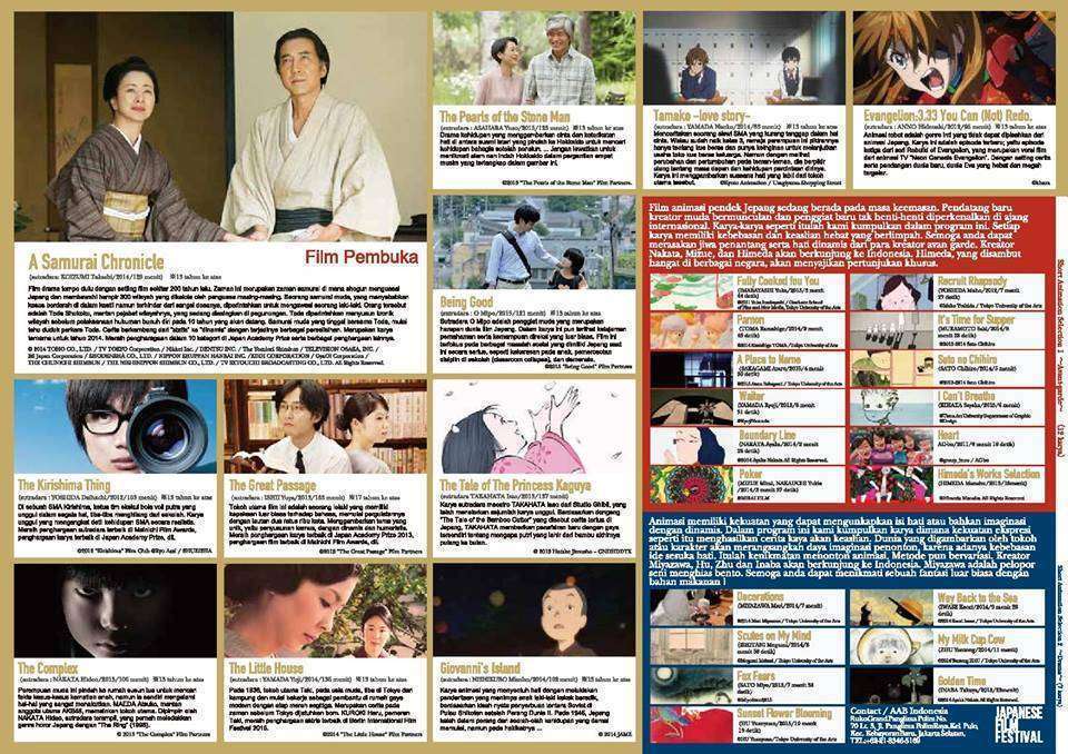 Pada acara in, akan diputar beberapa film-film Jepang yaitu A Samurai Chronicle (2014) yang disutradarai oleh Takashi Koizumi, The Kirishima Thing (2012) yang disutradarai oleh Daihachi Yoshida, The Great Passage (2013) yang disutradarai oleh Yuya Ishii, The Complex (2013) yang disutradarai oleh Hideo Nakata, The Little House (2014) yang disutradarai oleh Yoji Yamada, The Pearls Of The Stone Man (2015) yang disutradarai oleh Yuzo Asahara, serta Being Good (2015) yang disutradarai oleh Mipo O.