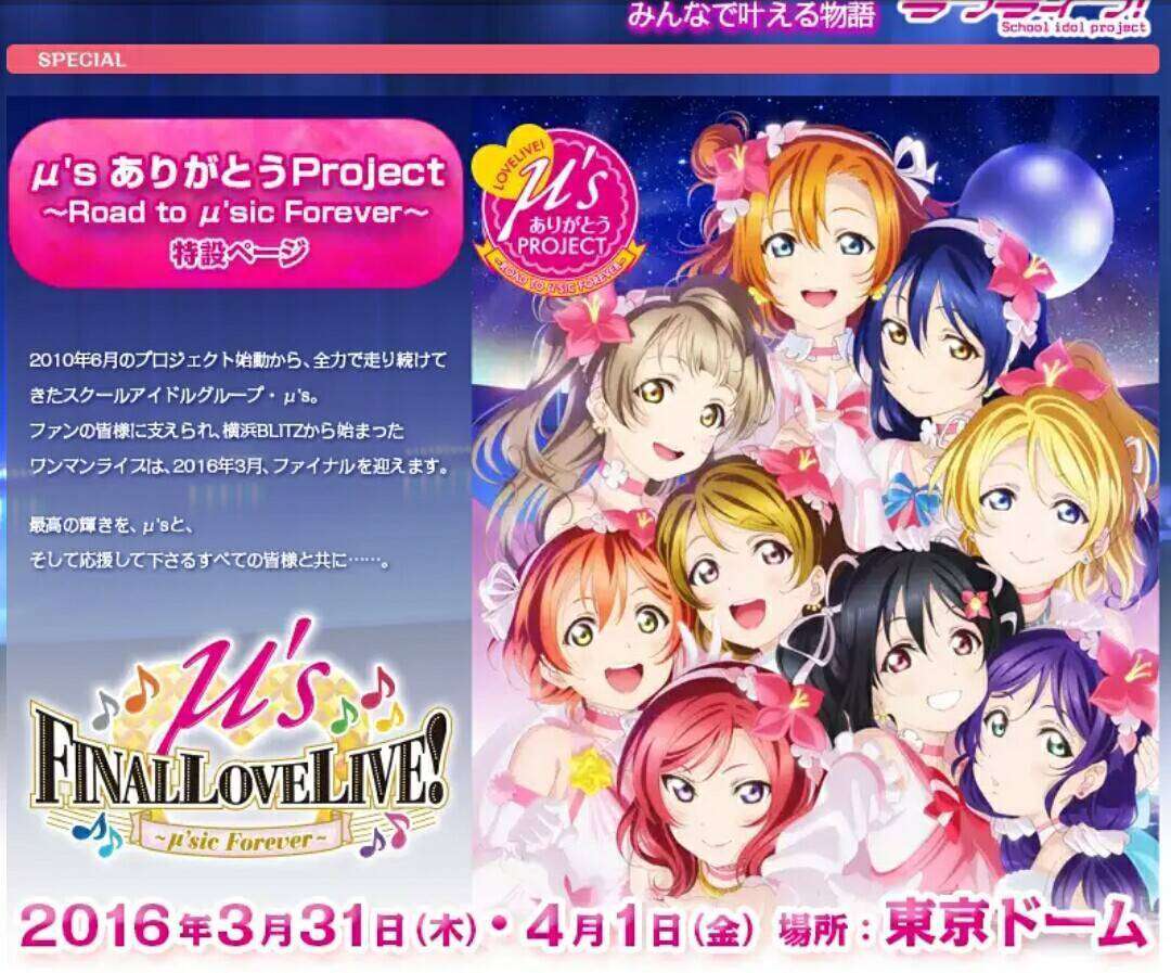 Bertajuk μ’s Final Love, konser “terakhir” ini akan dihelat pada 31 Maret dan 1 April 2016 di Tokyo Dome, Jepang. Selain itu, album “terakhir” grup ini akan dirilis pada 2 Maret, bertajuk Love Live! μ’s Arigatou Project ~Road to μ’sic Forever~.