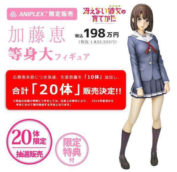 Kabar gembira bagi para maniak Megumi Kato dari anime Saekano alias Saenai Heroine no Sodatekata. Sebagaimana telah diberitakan sebelumnya, Megumi akan hadir dalam bentuk figur 1 banding 1. Sebelumnya sempat dikabarkan bahwa figur 1 banding 1 dari Megumi Kato tersebut akan memiliki ukuran tubuh sebesar H1580 × W560 × D500mm dan berat 28kg. Figur ini akan dibanderol dengan harga sebesar 1.980.000 yen atau setara dengan 230.000.000 rupiah dan hanya akan diproduksi sebanyak 10 buah saja.