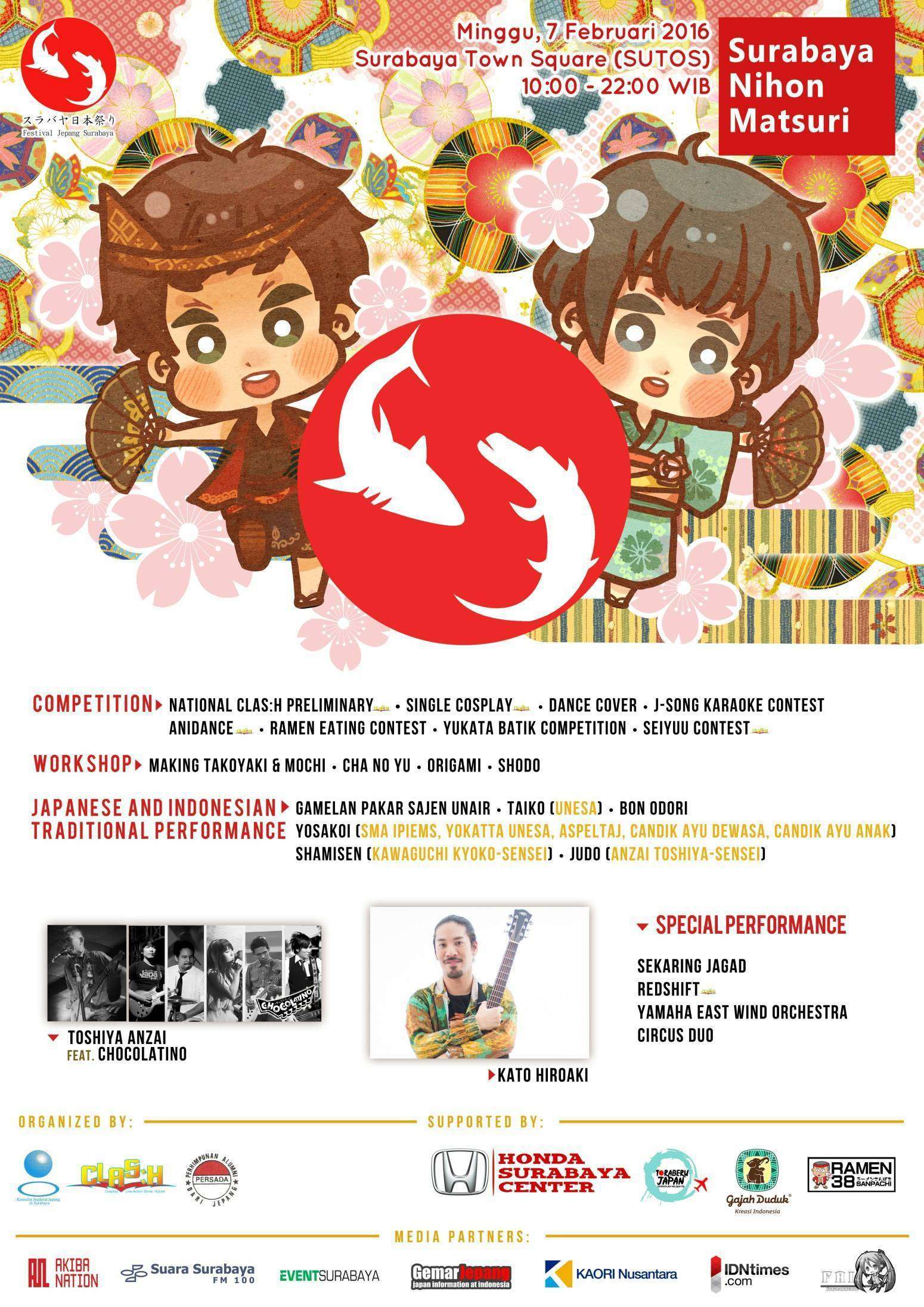 Konsulat Jenderal Jepang di Surabaya bekerja sama dengan Clas:H Cosplay dan Persada Jatim menyelenggarakan Surabaya Nihon Matsuri (Festival Jepang Surabaya) yang akan dilaksanakan pada :