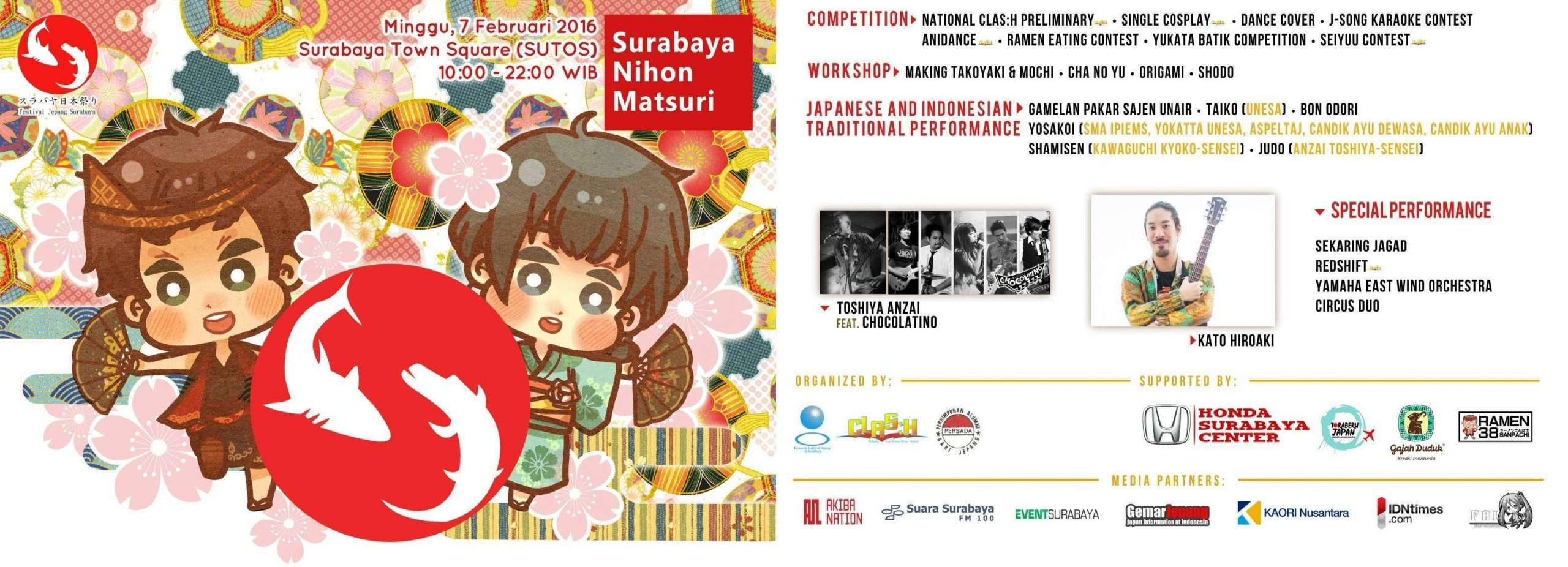 Pada Surabaya Nihon Matsuri besok, akan ada kompetisi regional CLAS:H sebagai bagian dari gelaran tersebut. selain CLAS:H, akan ada juga berbagai macam lomba budaya pop jepang seperti Karaoke, Dance cover serta Seiyuu contest. Bila Anda belum tahu mau ke mana akhir pekan in atau ingin tahu lebih dalam soal cosplay atau budaya pop Jepang lainya, datang saja ke Surabaya Nihon Matsuri 2 di Surabaya Town Square pada 7 Februari 2016 besok!