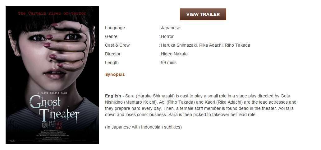 Jaringan bioskop CGV Blitz dan Cinemaxx masing-masing akan memutar film horror asal Jepang Ghost Theater. Belum ada informasi lebih lanjut kapan Cinemaxx akan mulai memutarnya. Namun CGV Blitz telah mengumumkan akan mulai memutarnya mulai hari Rabu 16 Maret 2016.